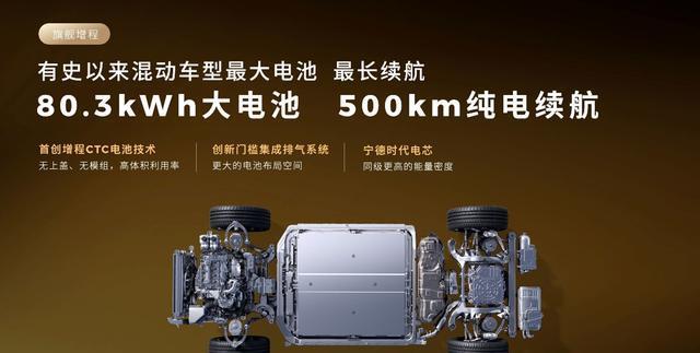 纯电版车型则基于1000V高压平台技术开发,搭载三电机系统,综合功率达到540千瓦,0-100km/h加速时间进入3秒级,性能表现突出。电池方面,纯电版采用宁德时代最新混合电芯,容量为115kWh,CLTC纯电续航720公里;依托千伏平台优势,该版本15分钟可补能350公里以上,大幅缓解用户的续航焦虑。